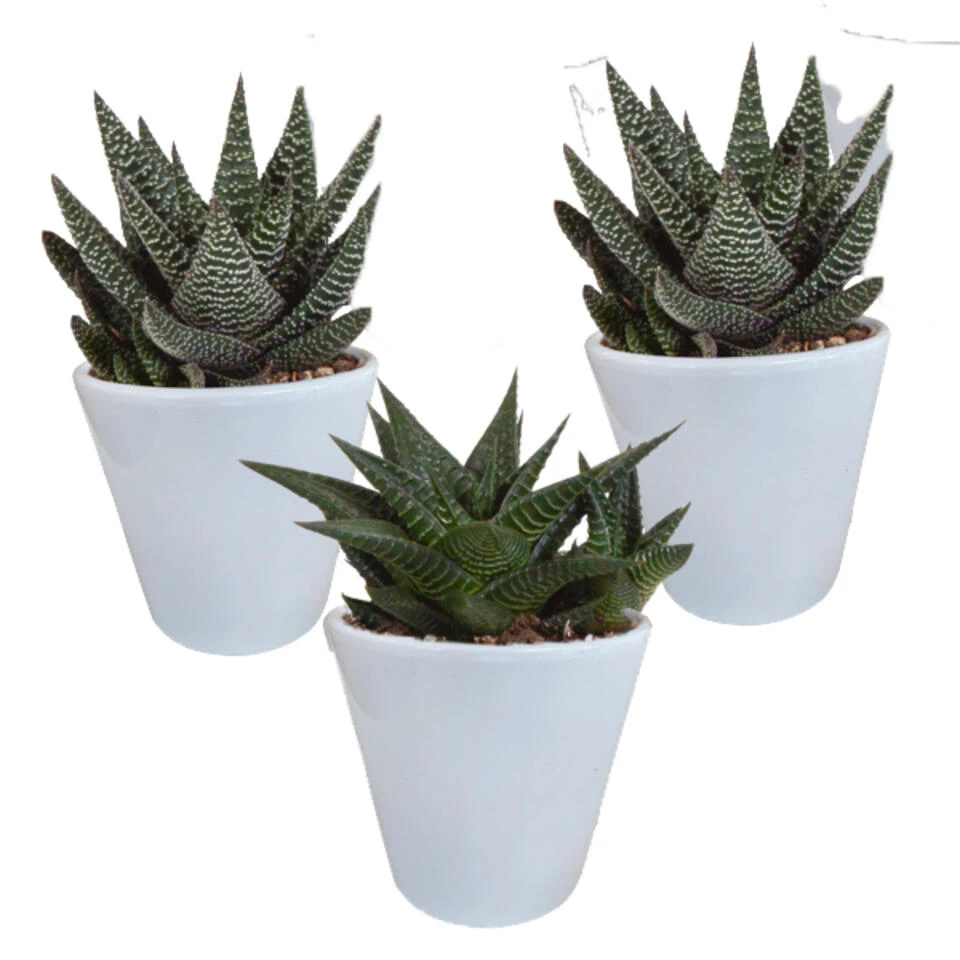 De Gasteria en Haworthia Mix bestaat uit 3 gezellige vetplantjes. Voor als je niet kunt kiezen! Deze speelse set, die geleverd wordt inclusief witte potjes, voorziet je interieur meteen van een gezellige, frisse touch! Doordat ze ook nog eens onderhoudsvriendelijk zijn, is het ook nog eens een praktische mix.