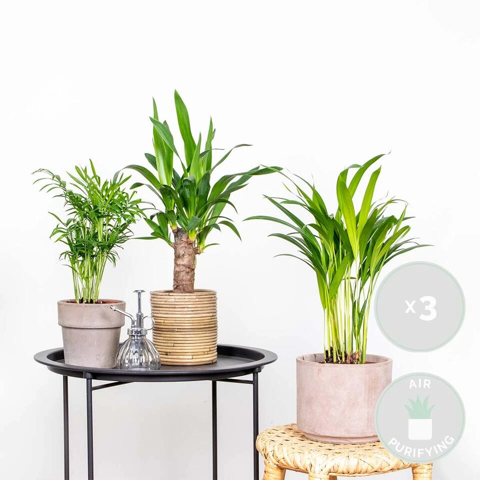 Haal de tropen naar jouw huiskamer met de Tropische Palmen Mix! Laat het zonnetje maar schijnen en waan je in de tropen met deze onderhoudsvriendelijke Dypsis-Chamaedorea-Yucca palmen. Deze palmen zijn geknipt om in jouw woonkamer te vertoeven en door hun gemakkelijke karakter waan jij je zo in de tropen. Naast dat deze palmen er fantastisch uitzien, zuiveren deze planten ook nog eens de lucht! Wij weten het zeker, deze drie kanjers toveren in een mum van tijd jouw huis om in een groene oase.