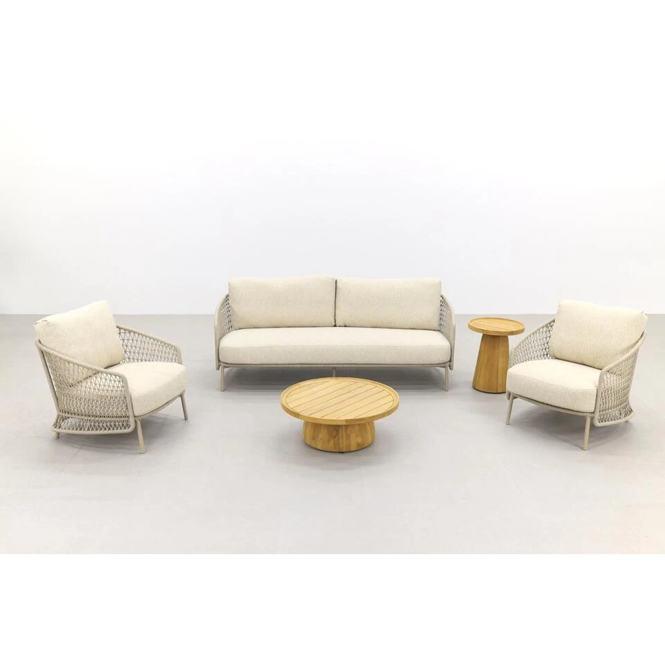Genieten van optimaal comfort en het perfecte plaatje. 4 Seasons heeft haar best gedaan met deze loungeset om het allemaal werkelijkheid te maken! Het prachtige touwpatroon van de Puccini bank en stoelen, het detail in het teakhout en natuurlijk de prachtige latte kleur. Deze solo kleur in de stoelen en de bank zorgt voor een unieke uitstraling. Daarbij past het warme teakhout van de Pablo koffietafels perfect bij! Door de royaal gevulde kussens zit je uitstekend in deze loungeset! Je drankje kan je gemakkelijk kwijt opeen van de twee koffietafels. Wat wil je nog meer? Helaas hebben wij geen invloed op de zon, al kan deze set ook tegen een regenbui! Bestellen kan direct online. Liever eerst even proefzitten? Kom dan langs in onze showroom in Opheusden, Duiven of Apeldoorn. Je bent van harte welkom!Â