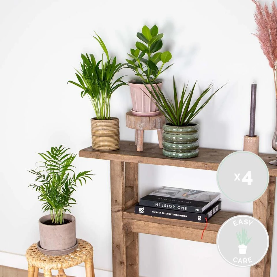 Haal power in je huis met de onderhoudsvriendelijke kamerplanten mix! Deze mix bestaat uit vier onderhoudsvriendelijke kanjers (Dracaena-Dypsis-Clusia-Chamaedorea) en die ook nog eens sterke karakters hebben. Naast dat ze tegen een stootje kunnen, zuiveren zij ook nog eens jouw lucht en dat met hun hippe uitstraling. Alle 4 de planten hebben dezelfde karakters, maar hebben allemaal een andere uitstraling, dit maakt het nog leuker om naar te kijken.
