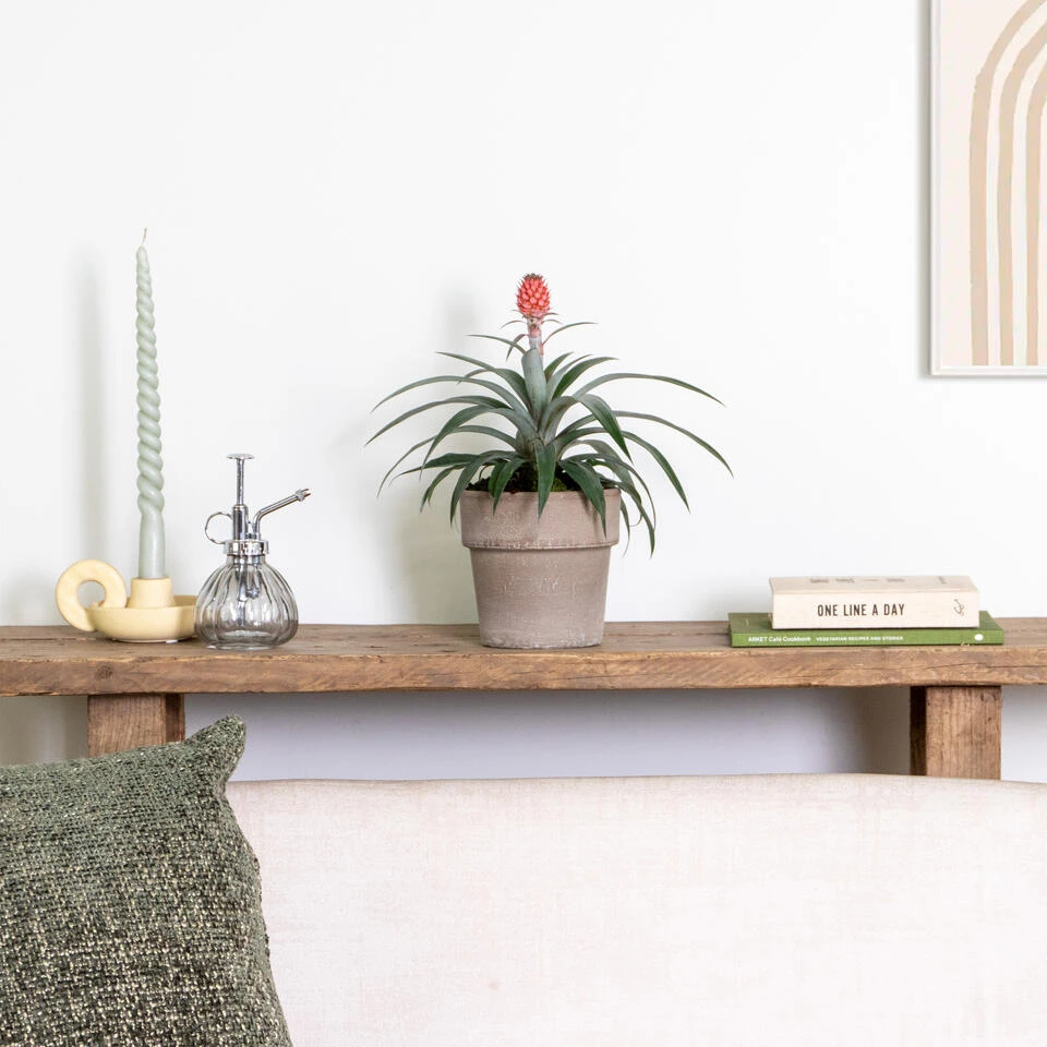 Zeg vaarwel tegen snurken, de Ananas comosus ‘Rosita’ staat naast haar tropische looks ook wel bekend als de anti-snurk plant. Deze tropische onderhoudsvriendelijke topper heeft haar weg gevonden naar jouw huis – en dan vooral jouw slaapkamer. De Rosita is het kleinere zusje van onze Amigo en groeit en bloeit net wat anders dan haar grotere broer. Zij pronkt namelijk met een roze ananas, die vervolgens door haar groei proces bloemetjes bloeit, die uiteindelijk naar binnen keren en zo pronkt er uiteindelijk een lovende groene ananas aan de horizon.