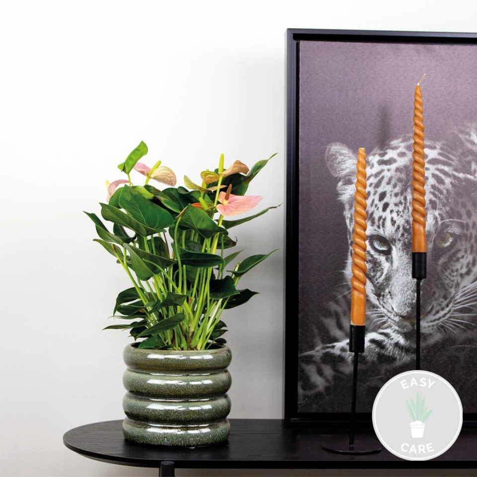 De Anthurium andreanum ‘Aristo’ heeft haar roots liggen in het verre Zuid-Amerika. Deze flamingoplant is zo’n succes door haar sterke karakter en bloei. Niet alleen is zij onderhoudsvriendelijk, ook laat zij haar altijd van haar beste kant zien. De anthurium is namelijk een van de langste non-stop bloeiende potplanten ter wereld. Het hele jaar door kan je genieten van haar felroze hartvormige bloemen. Kortom, de flamingoplant heeft onze harten wel veroverd! Is roze niet jouw kleur? Geen probleem, de anthurium is ook gewoon verkrijgbaar in het rood, wit of zelfs oranje.
