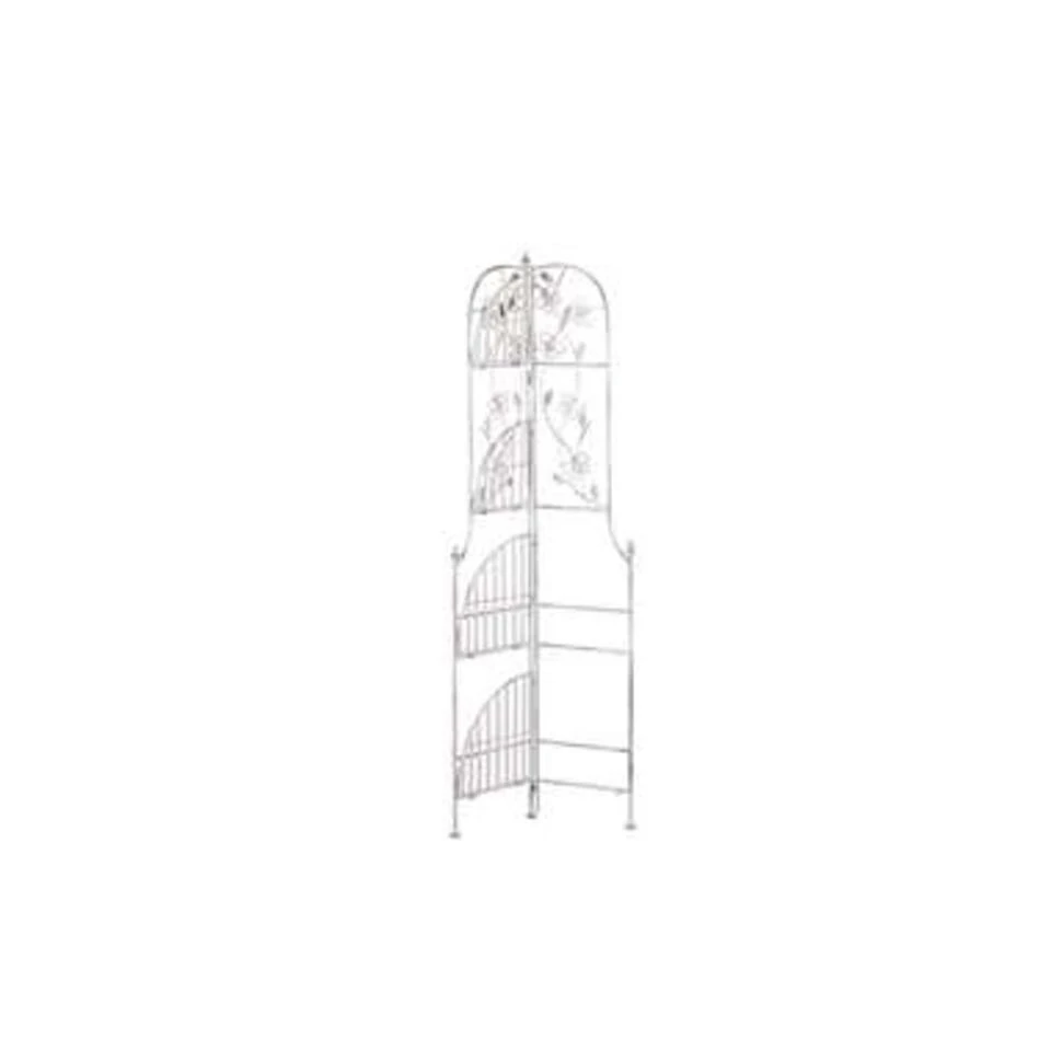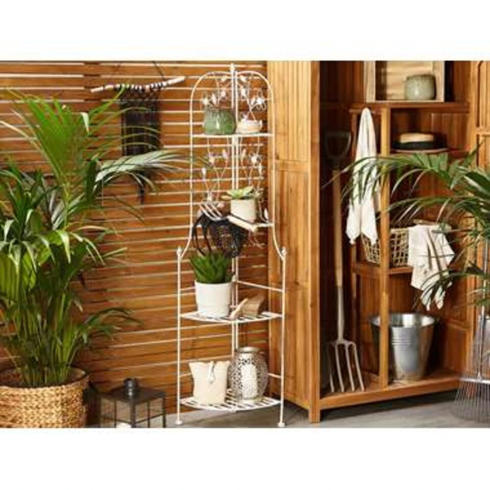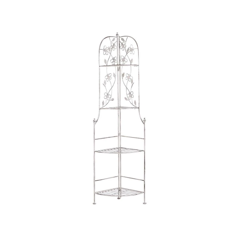 Inklapbare metalen tuinkast met romatische versieringen. Als je je omgeving wilt verfraaien en opruimen, maar daarvoor niet genoeg plek beschikbaar heeft, is deze hoekplank een oplossing. Het heeft een stevig ontwerp en is tegelijkertijd stijlvol en is opvouwbaar zodat je ruimte kunt besparen wanneer dat nodig is. Het past perfect in zowel de tuin als de badkamer en heeft op beide plaatsen een eigen rol.