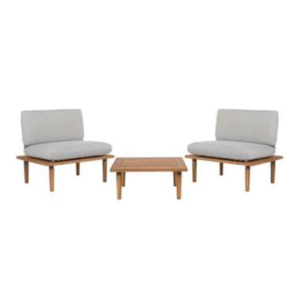 Tuinset met lichtgrijze kussens. Praktisch en mooi tegelijkertijd – deze loungeset van robuust acaciahout is de ideale toevoeging voor jouw tuin of op het terras. De 2 comfortabele zit- en rugkussens in lichtgrijs nodigen uit om te ontspannen en aan de vierkante bijzettafel kunnen allerlei hapjes en drankjes worden geplaatst. De set kan naar behoefte afzonderlijk of samen worden neergezet. Het straalt – dankzij zijn moderne design – een aangename lichtheid uit met een stijlvolle touch.