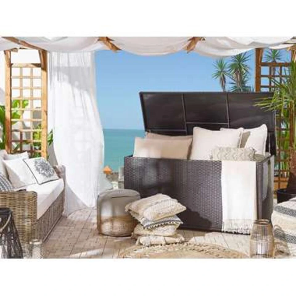 Praktische, brede opbergbox in bruin met veel opbergruimte. Deze kussenbox biedt veel opbergruimte en beschermt jouw kussens en dekens tegen water en zon. Dankzij de twee praktische handgrepen aan de zijkanten is de tuinkist gemakkelijk te vervoeren. Het rotandeksel kan gemakkelijk worden geopend en gesloten met twee gasveren. Een zwarte binnenschaal voorkomt het binnendringen van vuil en insecten. Het binnenste omhulsel uit één stuk is bevestigd met een sterke klittenbandsluiting en heeft dus optimale grip en kan indien nodig worden vervangen of gewassen. Houd er rekening mee dat bij zware en langdurige regenval de doos moet worden afgedekt.