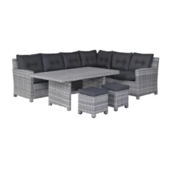Deze lounge dining set is vervaardigd uit een onderhoudsvrij aluminium frame met daaromheen weerbestendig L-shape wicker draad, waardoor je het hele jaar kunt genieten van deze mooie lounge dining set. Het wicker is gemaakt van een stevig kunststof waardoor de set zeer duurzaam is. De Alaska loungeset wordt compleet geleverd met hoogwaardige kwaliteit polyester zit- en rugkussens. De rugkussens hebben een klassieke uitstraling door de aangebrachte steps.