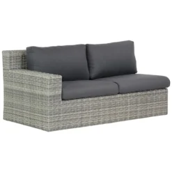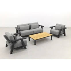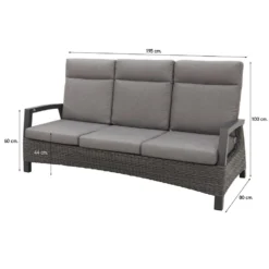 De afmeting van de setopstelling is L 255 x B 205 x H 85 cm, de tafel is L 150 x B 80 x H 66 cm en de kurkjes zijn B 40 x D 40 x H 46 cm. Gemaakt van wicker in de kleur organic grey met aluminium binnen frame en polyester antraciet kleurige kussens.