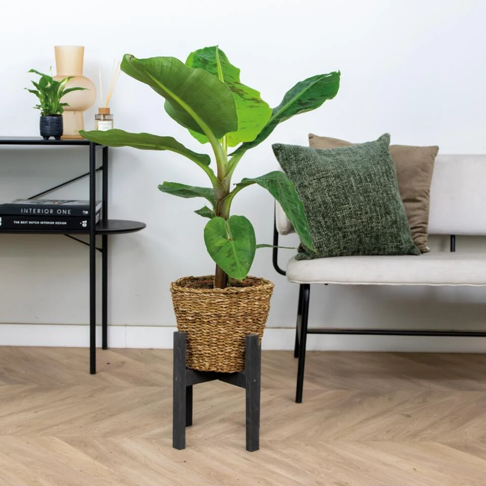 De Musa acuminata ‘Dwarf Cavendish’ Incl. Zeegras Mand is een kleinblijvende variant van de bananenboom. De ‘Dwarf Cavendish’ is de beste variant om binnenshuis te houden. Deze bananenplant is een snelle groeier waarbij je iedere week wel weer een nieuw blad kunt zien. Ook al spreken we hier van de dwergvariant, deze Musa kan wel een hoogte van 2-3 meter binnenshuis wel bereiken. Een plant die een ware indruk gaat achterlaten en een tropische wind door ieder interieur kan laten waaien.