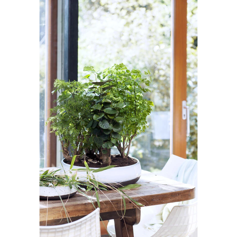 In een notendop Hier zie je de Polyscias fruticosa. Een klein boompje voor bij jou in huis! Oorspronkelijk groeit de Polyscias op eilanden in de Pacifische oceaan. In het wild worden deze bomen zo’n 2 – 6 meter hoog en zorgen ze met hun grote bladeren voor veel schaduw. Polyscias betekent dan ook ‘veel schaduw’ in het Grieks. Deze polyscias heeft echter een handiger formaat, zodat je binnenshuis ook van deze prachtboom kunt genieten. De Polyscias fruticosa staat ook bekend als de Ming Aralia. Hij bestaat uit vele opwaarts-groeiende vertakkingen, waardoor het geheel eruit komt te zien als een groepje van meerdere bomen. Het heeft kleine, groene bladeren die zacht aanvoelen en helder van kleur zijn. Het gebladerte heeft wat weg van varenblad. Met dit artistieke binnenboompje krijgt je interieur een tropisch gevoel. Alles op een rijtje – Deze Polyscias fruticosa wordt per stuk geleverd- De leveringshoogte van deze planten zijn 60 cm (incl. pot)- Geleverd in kweekpotten van 17 cm- Een compact boompje voor in huis- Mooie opwaartse vertakkingen- Latijnse naam: Polyscias fruticosa Verzorging Een Polyscias houdt niet van droge lucht, daar vallen zijn bladeren van uit. Dit maakt het een perfecte plant voor in de badkamer of keuken. Op andere plekken in huis kan hij ook prima staan, zolang je zorgt voor voldoende luchtvochtigheid. Dit kun je doen door hem op een bodem van kiezelstenen te plaatsen, of af en toe nat te spuiten met een plantenspuit. Hij kan vrijwel overal staan, behalve in direct zonlicht. Geef hem water zodra de potgrond is opgedroogd. Je kunt beter iets te lang wachten dan dat je hem te snel weer water geeft. Bloomique Bloemen en planten brengen de plaatsen waar we leven, pas echt tot leven. Het zijn aankopen of cadeau’s waar je geen genoeg van krijgt. Ons assortiment van kamer- en tuinplanten heeft voor ieder interieur en tuin een stijlvolle match. Een sfeervol thuis, dat is pas een fijn geschenk! Door altijd fair-trade te handelen garanderen we dat jij niet de enige bent die gelukkig wordt van onze bloemen en planten.Bloomique streeft naar optimale bescherming tijdens de verzending. Onze speciale plantenverpakking zorgt er voor dat de plant op de juiste positie blijft. Onze verpakkingstechniek houdt rekening met het beschermen van de wortels, bladeren en bloemen van de plant. Zo blijven ze gezond en onbeschadigd als ze onderweg zijn met de pakketdienst naar jou! Iedere plant is uniek. De afbeeldingen die je hier ziet zijn van de verwachte resultaten wanneer de planten volgroeid zijn. Verschillende groeiomstandigheden kunnen voor een andere uitkomst zorgen. Ga daarom voor aankoop goed na of deze planten geschikt zijn voor jouw huis of tuin.