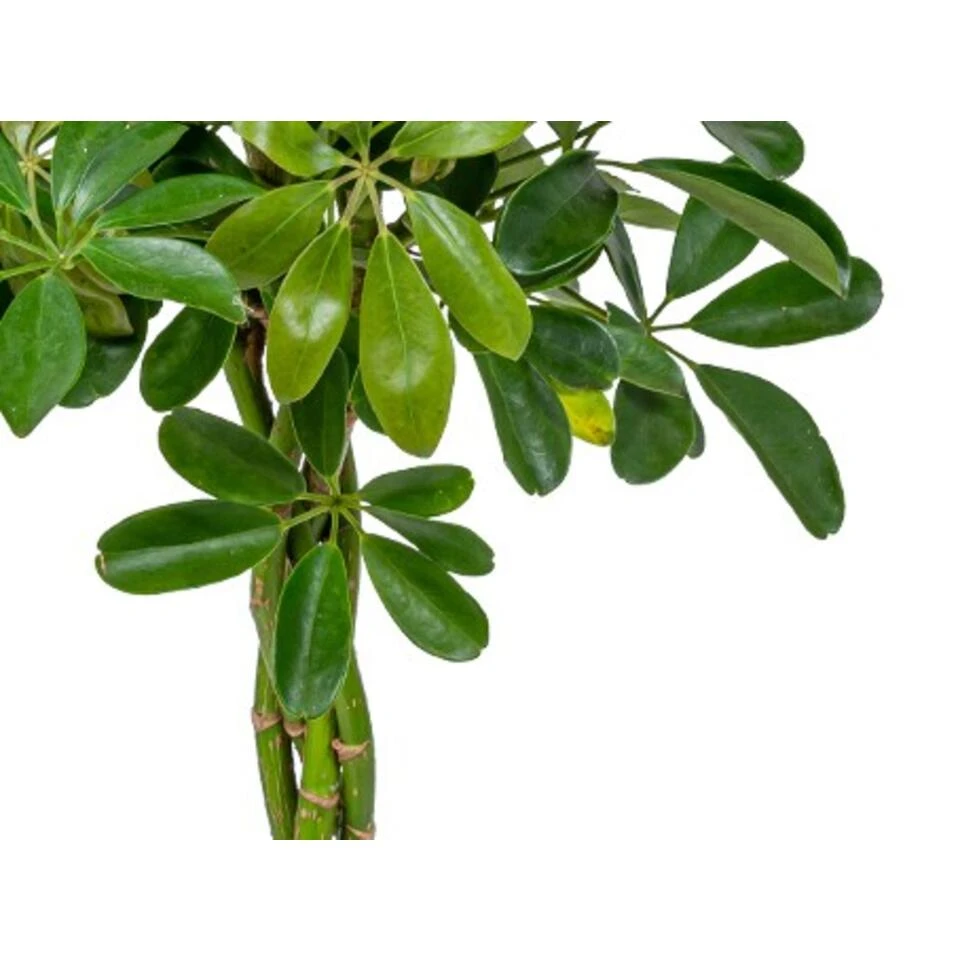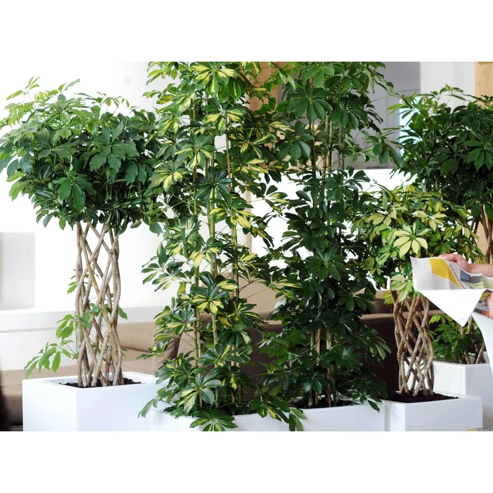Hier zie je de vrolijke vingersboom; de Schefflera arboricola. De bijnaam vingersboom komt van de ovaalvormige bladeren die in groepjes bij elkaar groeien. Ze buigen licht naar buiten toe. Samen met de combinatie van lichte geel en groen kleuren, maakt het van deze plant een kamerplant met een vrolijk karakter. Oorspronkelijk komt de vingersboom uit Australië, behorend tot de Araliaceae familie. Je kunt deze plant goed snoeien, waardoor je voor meerdere uiterlijken kunt gaan. Ga bijvoorbeeld voor een strakke ronde vorm, of laat hem vertakken tot een wilde binnenboom.