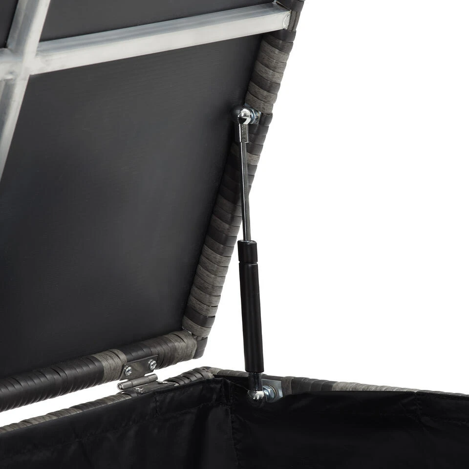 De veelzijdige opbergbox Kuusamo combineert veel opbergruimte met een aantrekkelijk design. Het moderne weefsel is gemaakt van duurzaam wicker, het stabiele frame is gemaakt van roestvrij aluminium – een ideale combinatie voor buitengebruik het hele jaar door. Onder het versterkte deksel met soepel openingsmechanisme biedt de uitneembare binnenvoering van ademend polyester extra bescherming tegen weer en wind. Dankzij de praktische handgreepriem, de twee volledig roterende wielen met blokkeerremmen en het lage gewicht is het verplaatsen van de functionele opbergbox gemakkelijk en comfortabel.