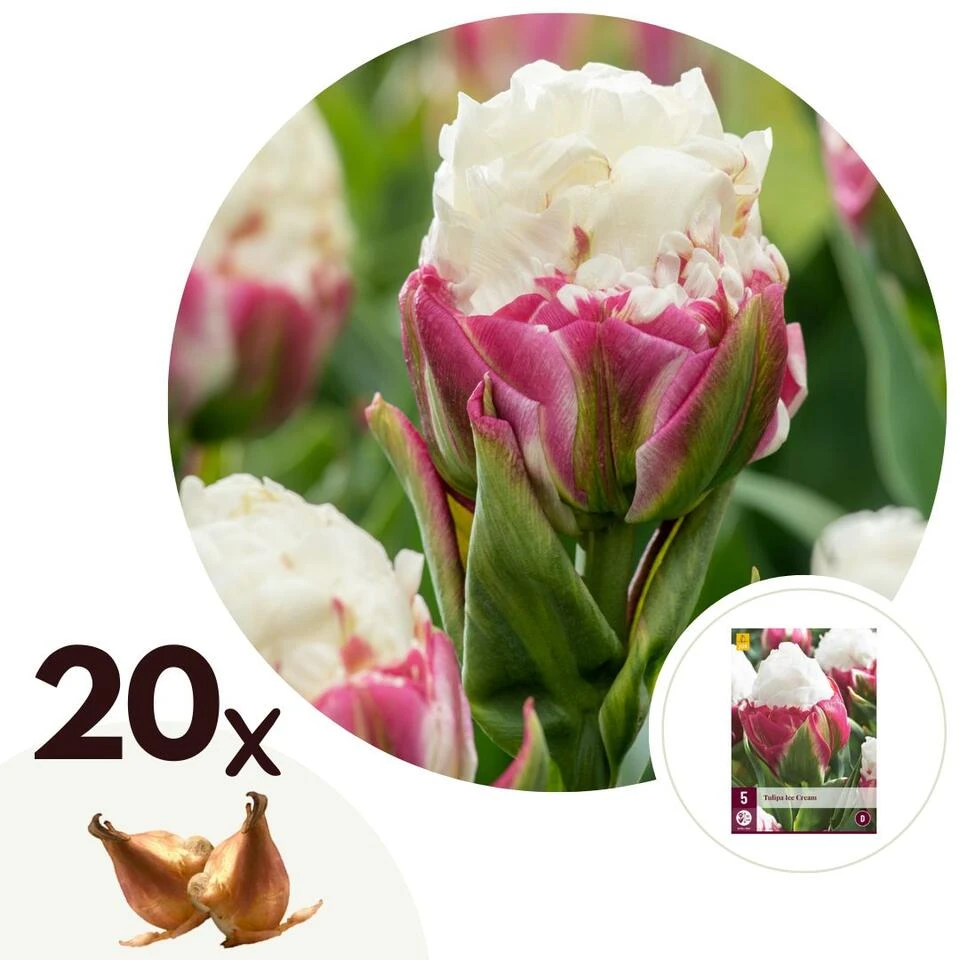 ProductinformatieTulipa Ice Cream is een zeer bijzondere dubbele tulp. Met zijn zachte pasteltinten en delicate vorm is deze tulp een lust voor het oog. De bloembladeren hebben een wit hart en dieproze buitenkant. In de volle zon openen de bladeren van de tulp volledig. Met deze bijzondere tulp lijkt het net alsof je een heerlijk ijsje in de tuin hebt!