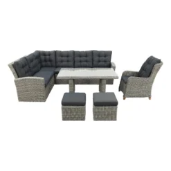 Twijfelt u tussen een loungeset en een diningset? Dan is dit de ideale tuinset voor u. Doormiddel van de hoge tafel kunt ook nog eens eten aan de loungeset. De loungeset heeft een hoge rugleuning wat het zitten tot een feestje maakt. Als de zitkussenhoezen vuil zijn geworden kunt u deze uitwassen. De handige krukjes hebben een dubbele functie, ze kunnen gebruikt worden als krukje maar ook als bijzettafeltje.