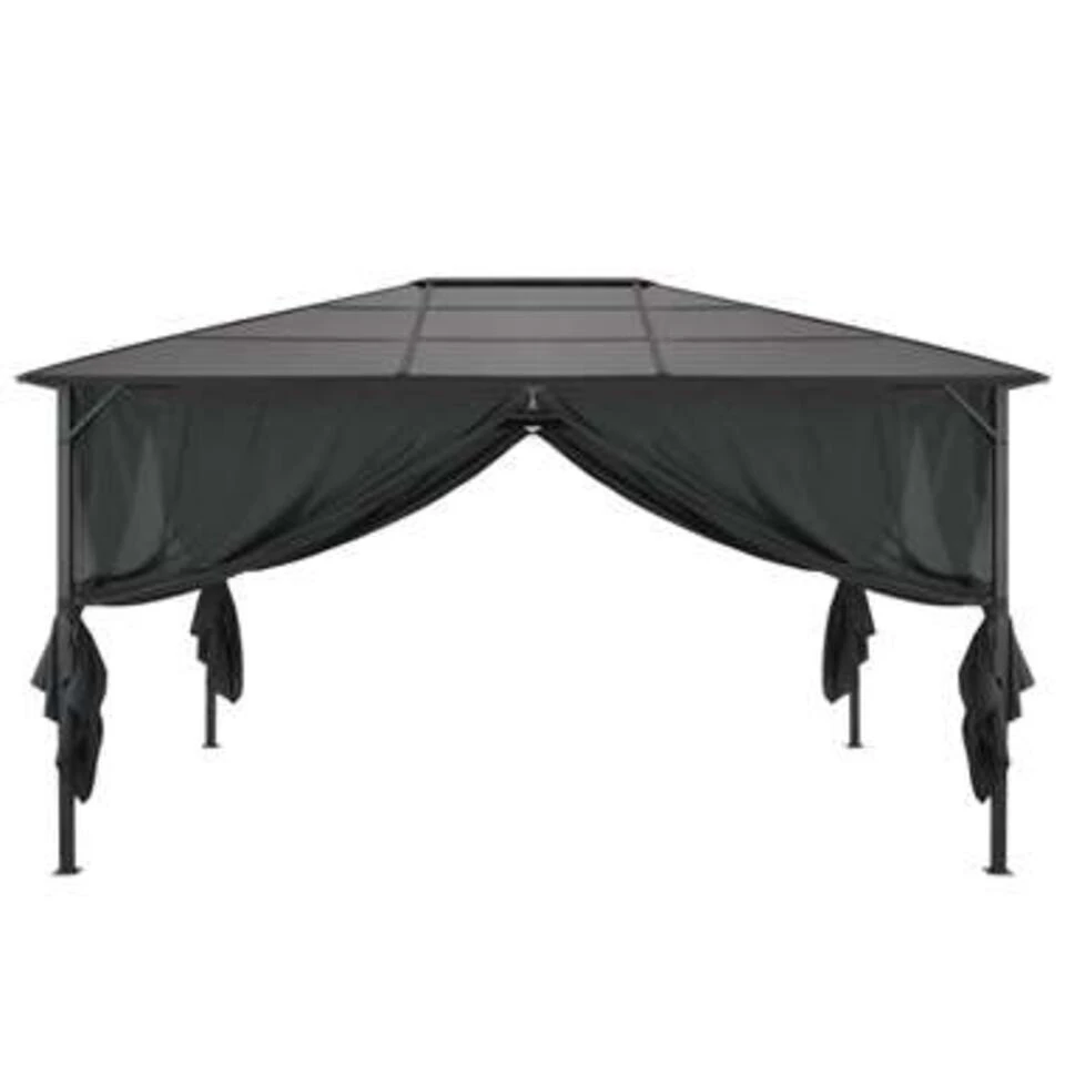 Het dak, gemaakt van 6 mm dik uv-bestendig pc-bord, beschermt je tegen de schittering en schadelijke uv-stralen van de zon. Het prieel is stevig geconstrueerd van sterk aluminium en staal, en is daardoor bestand tegen roest en zeer stabiel. Het tuinpaviljoen wordt geleverd met 4 zijwanden, die bij slecht weer kunnen worden ingetrokken. Klittenband is ook inbegrepen voor eenvoudige bevestiging van de gordijnen.